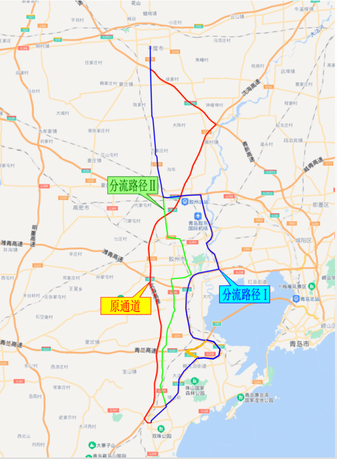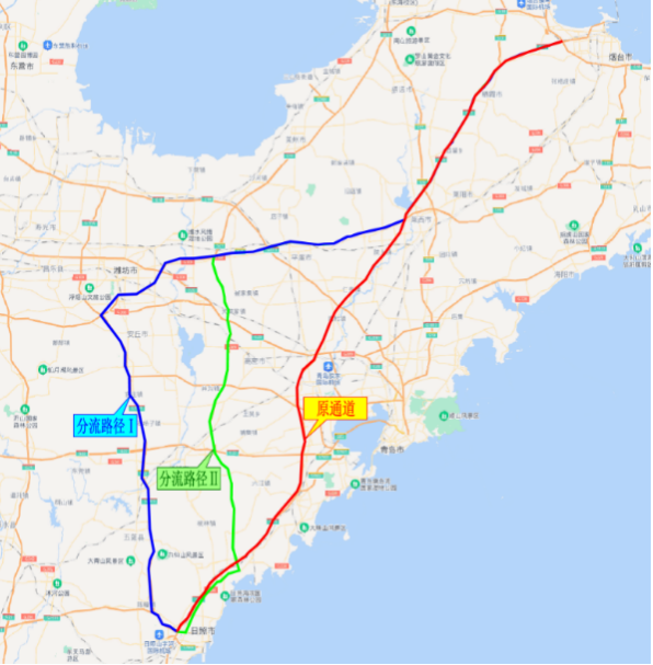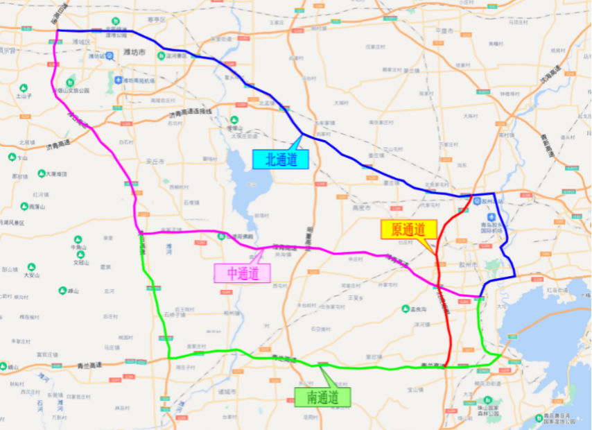 利用青银高速、潍青高速、潍日高速、青兰高速为潍坊至青岛的分流路径。