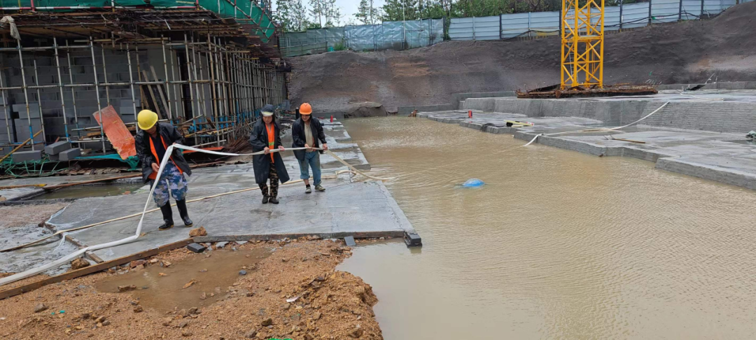 7月20日,地产集团和川项目部连夜启动防汛应急预案,防汛应急队伍20余人全部在岗备勤,潜水泵、铁锹、雨衣、雨靴、防汛沙袋等排水防汛物资完成点验、检修,确保降雨时随调随用。同时对基坑,高堆土、脚手架、电气设备等关键设施、重点部位进行巡查,填补漏洞。本次降雨过程,施工现场未出现任何基坑坍塌、触电漏电及工程实体受损等事故,现场清理和积水抽排工作正紧张而有序的进行。