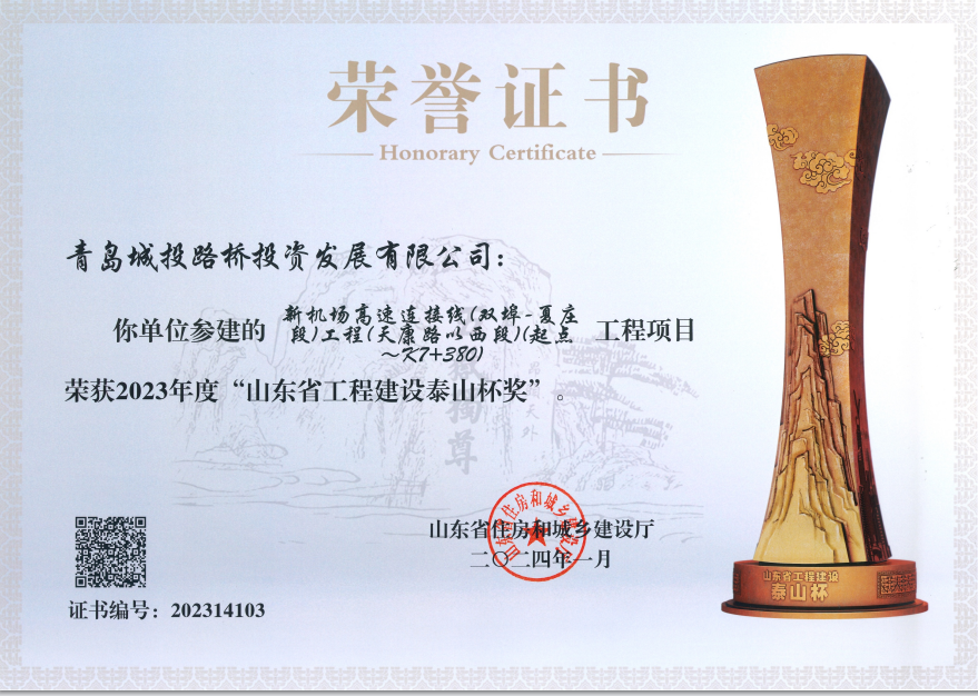 新机场连接线工程被山东省住房和城乡建设厅授予“2023年度山东省工程建设泰山杯”荣誉。