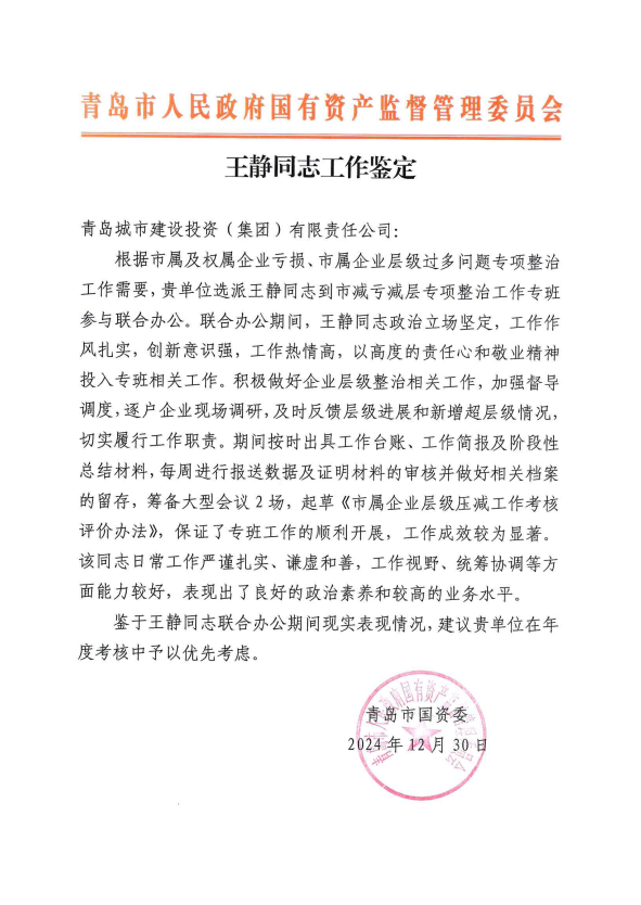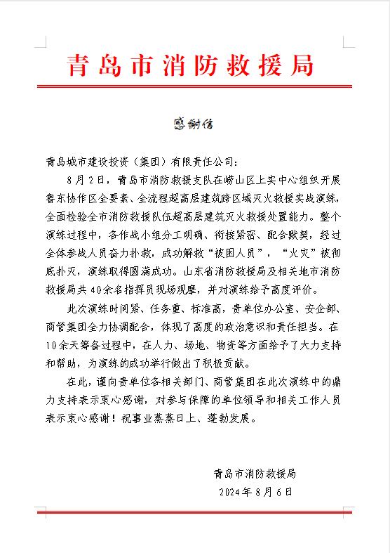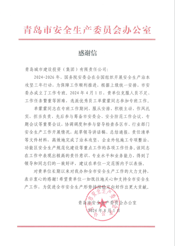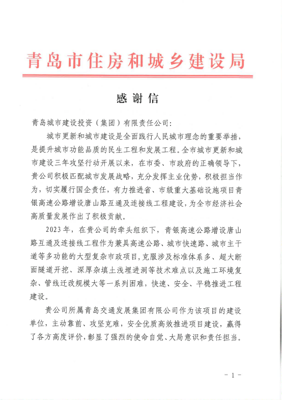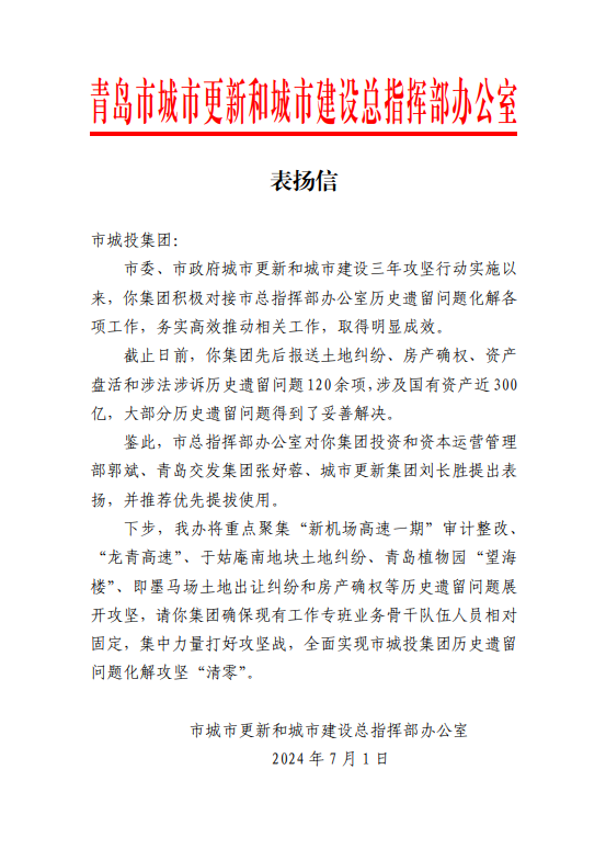 在过去的2024年,青岛城投集团全体干部员工全面贯彻落实党的二十届二中、三中全会精神,认真贯彻落实集团党委决策部署,以勇争上游的雄心壮志,“打头阵、当先锋”的进取意识,出色完成各项工作任务,涌现出了一批表现优异、成绩突出的集体和个人,收获了131项集体荣誉、67项个人荣誉,以及来自多个单位的26封感谢信。社会各界的认可与感谢,就是城投集团继续奋进前行的不竭动力!以下为2024年度部分荣誉和感谢信集锦: