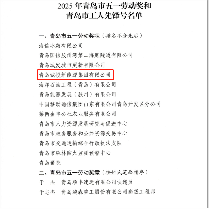 4月30日,青岛市总工会公布了《关于表扬2025年青岛市五一劳动奖和青岛市工人先锋号的通报》,青岛城投新能源集团被授予“青岛市五一劳动奖状”。这一荣誉的获取既是对新能源集团绿色惠农、践行乡村振兴战略的嘉奖,更为勇当新能源行业绿色低碳高质量发展开路先锋注入了动力。