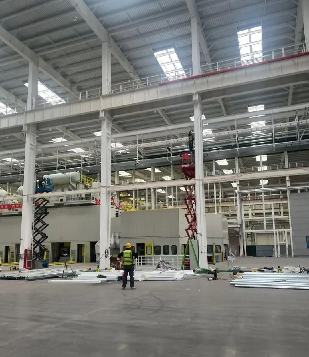在奇瑞冲压车间扩建和新建KD车间项目施工现场仍是如火如荼的繁忙景象,处处可见工人调试设备的忙碌身影,项目管理团队及施工工人共百余人坚守一线,争分夺秒抢工期,铆足干劲赶进度,用实际行动诠释“劳动最光荣”。项目作为省市两级重点项目,2024年6月正式开工建设,总建筑面积共35767平方米,总投资约1.35亿元,主要由冲焊联合厂房冲压生产区扩建和KD车间组成,是对奇瑞超级工厂提升产能、开展KD出口业务的有力补充和保障。目前KD车间及冲压扩建车间均已完成主体结构施工,进入设备调试阶段。城投集团将全力推进项目完成建设工作,力争早投产、早见效。