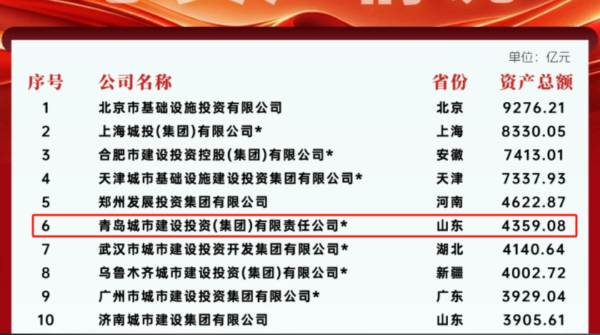 青岛城投荣登全国城投公司收入榜第5名